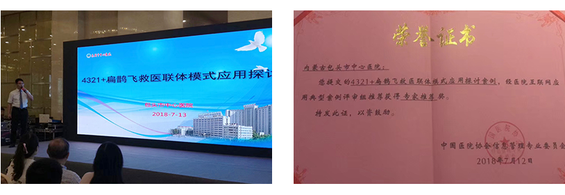 在2018年7月的中国医院协会信息网络大会暨中外医疗信息网络技术和软件产品展览会(CHIMA 2018)上,「4321+蜜桃成品人免费视频医联体模式应用探讨案例」经医院互联网应用典型案例评审组推荐荣获「专家推荐奖」 。