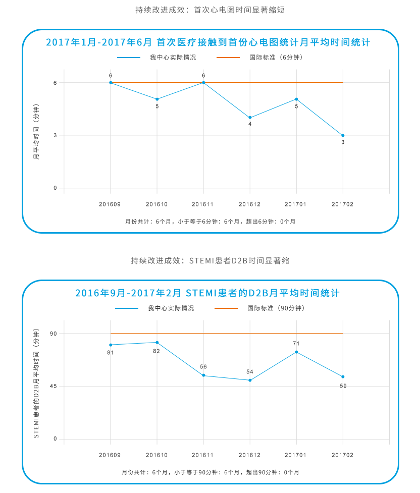 持续强化高效流程,胸痛中心的运行质态直接关系到患者的生命安全,医院多次通过质量分析会、典型病例分析会等方式,对流程及每个救治环节进行优化。多医院、多部门联合演练更是常态化。经过七个月的运行,与胸痛中心成立前比,患者D2B、首次心电图时间等关键质量控制指标趋势有明显改进,效率显著提供,抢救成功率大幅提升。