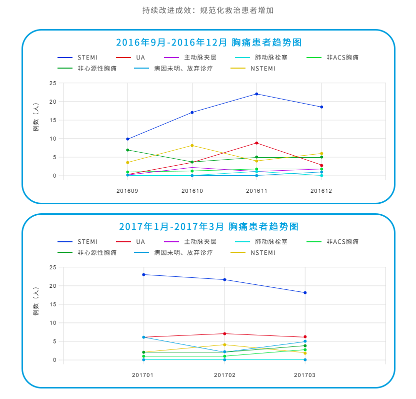 通过胸痛中心建设还进一步完善了冠心病出院管理及随访、双向转诊制度及社区卫生院的电子健康档案管理。